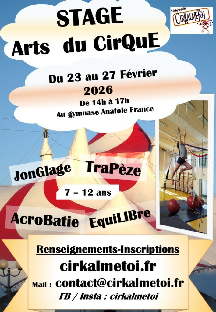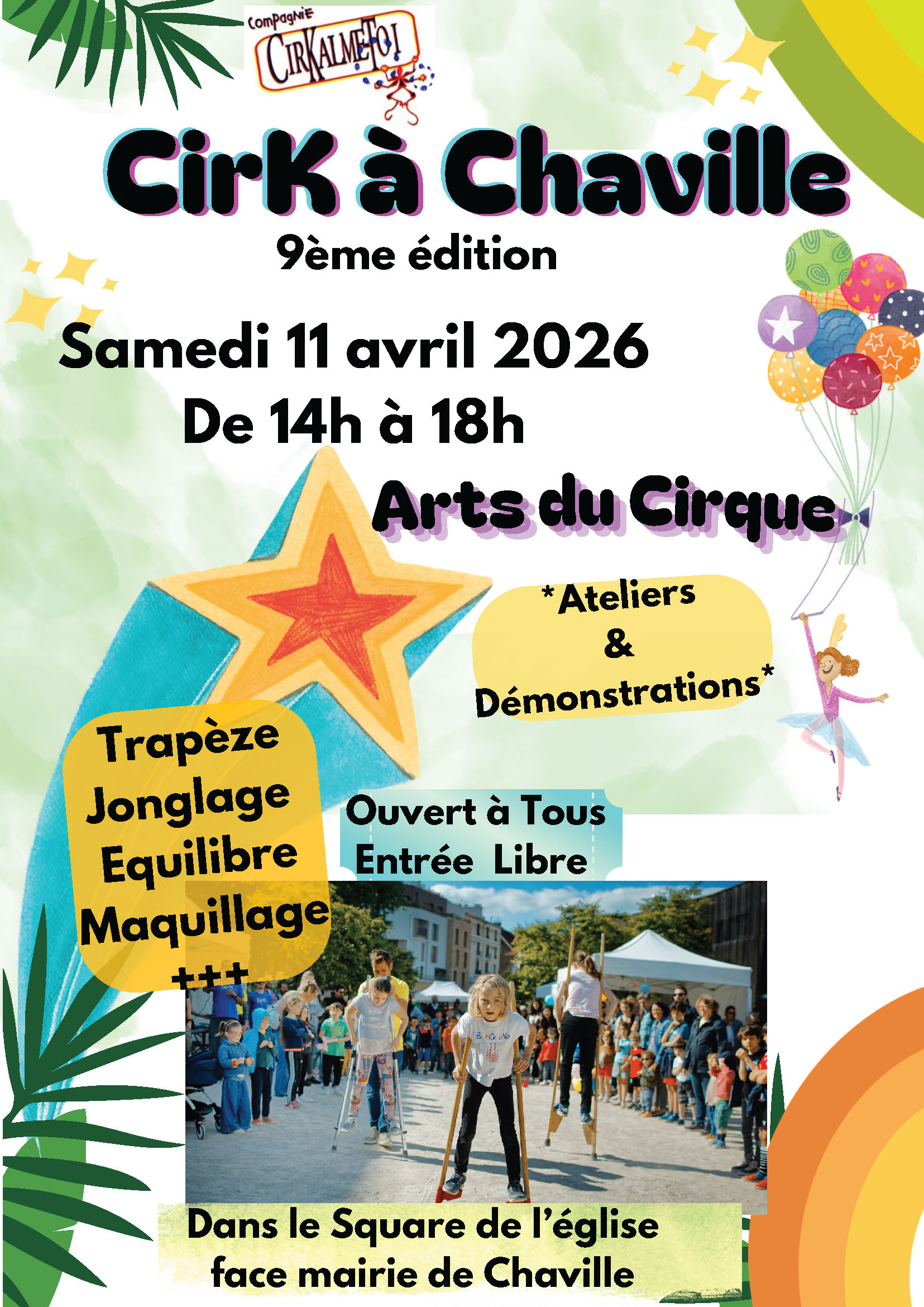 CirK à Chaville – 9ème Edition CirK à ChavilleLa Compagnie CirKalme-Toi vous propose de passer un bon moment ensemble… * Ateliers Cirque Ouverts à Tous * Jonglage – Equilibre – Trapèze – Maquillage – Jeux – Démonstration ! * Ouverture des animations à 14h 😉 …………………